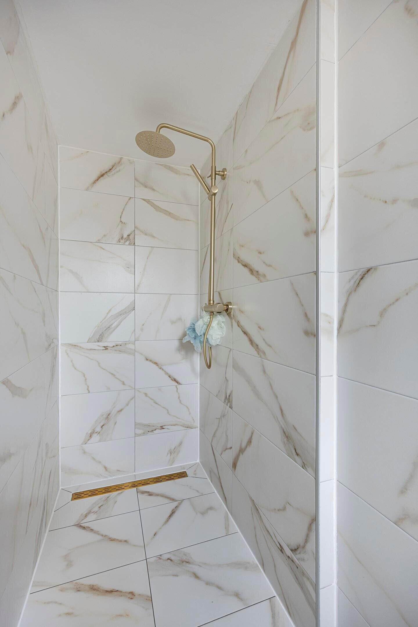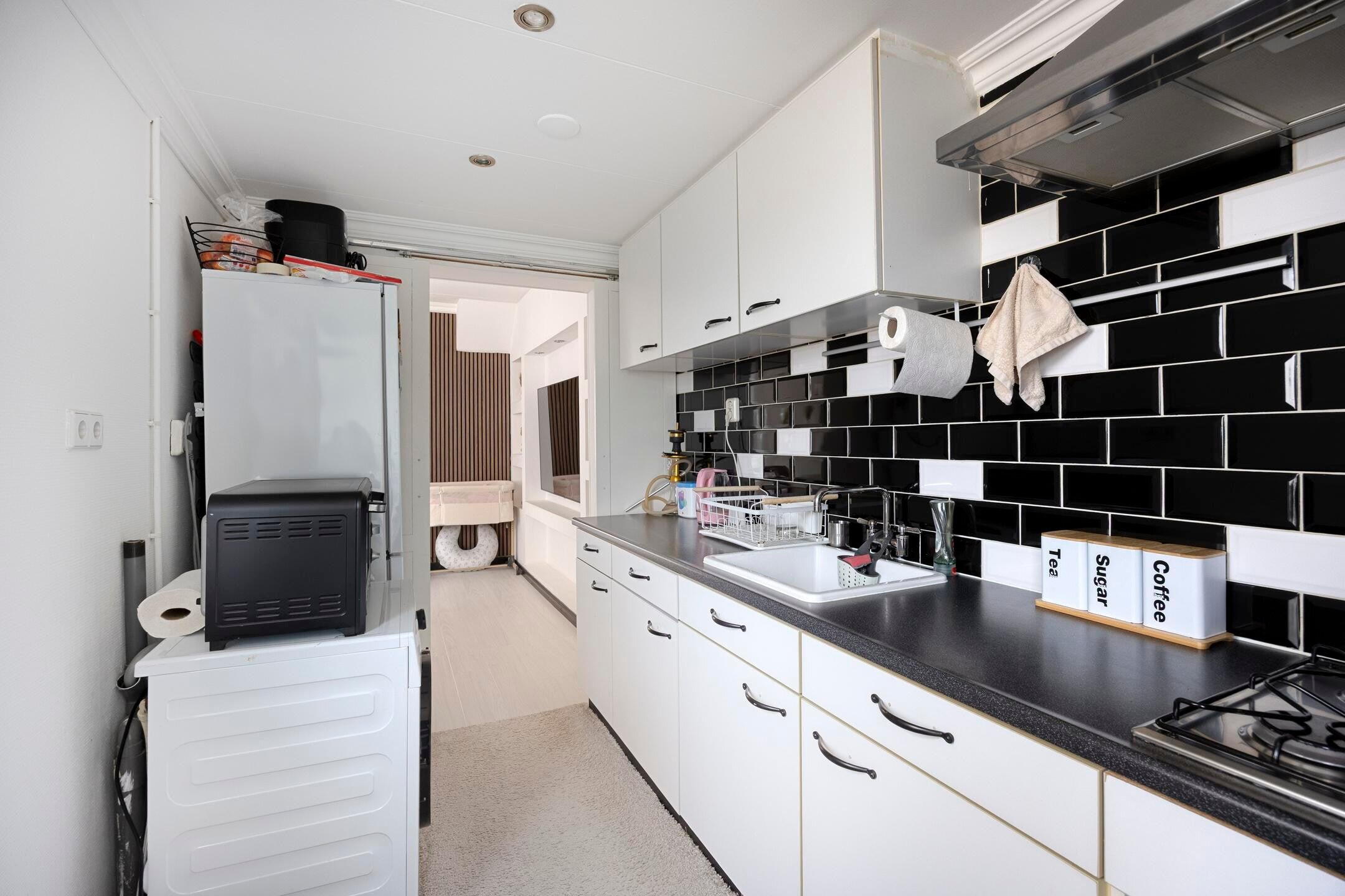 De keuken is eenvoudig uitgevoerd en beschikt over een gasfornuis en afzuigkap. Vanuit de keuken bereikt u via een tussenhal de badkamer en de tuin. De badkamer is voorzien van een douchecabine en toilet en is functioneel, maar gedateerd en toe aan modernisering.